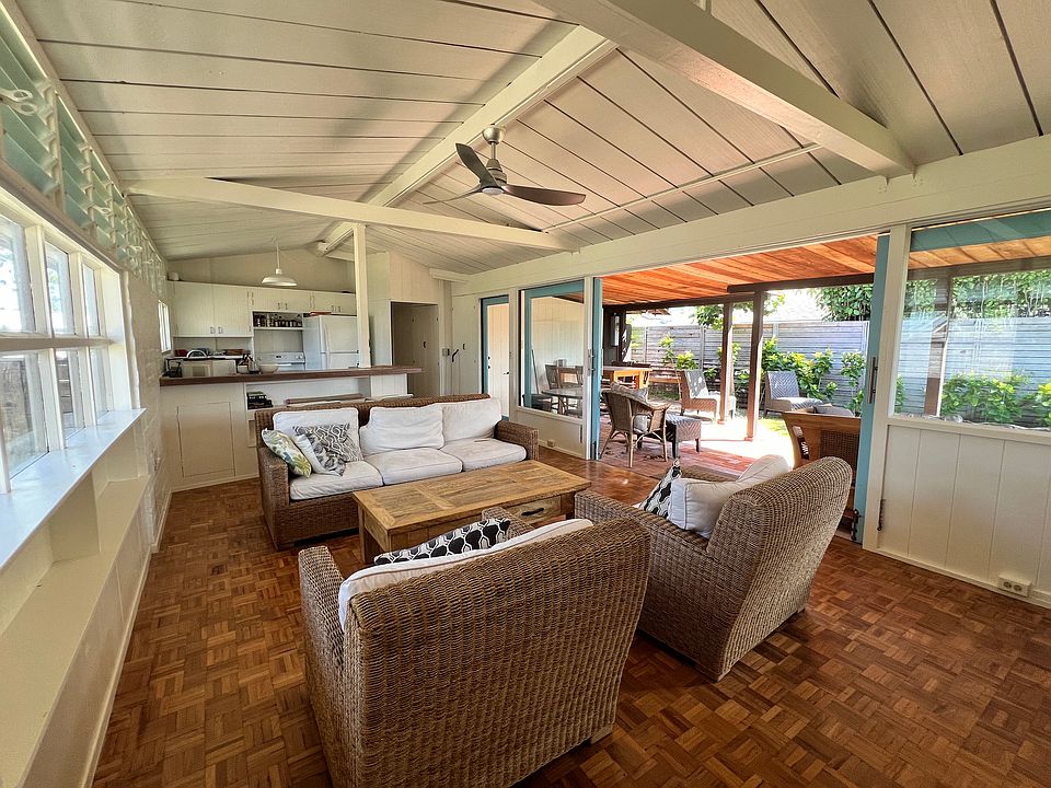 Embrace the tranquility and the timeless allure of Old Hawaii, just a short stroll from the welcoming sands of Kailua beach. This quiet and breezy two-bedroom bungalow with a private yard welcomes guests into an indoor-outdoor oasis of peace and relaxation. Comfortably accommodating up to four guests, this home is a welcome retreat for families, couples, or anyone longing to immerse themselves in island life.