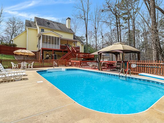This fabulous home with convenient access to I-85 features a beautiful outdoor space with in-ground pool, covered deck, fire-pit and much more. The master suite on the main level has his/her walk-in closets and luxury bath with whirlpool tub. Hardwood floors, granite counters, screened porch, jack-n-jill bath, and large bonus room are just a few of the features of this 4 bedroom home. The finished basement has its own laundry and kitchen as well as rec/den area - perfect for your teen or in-law!