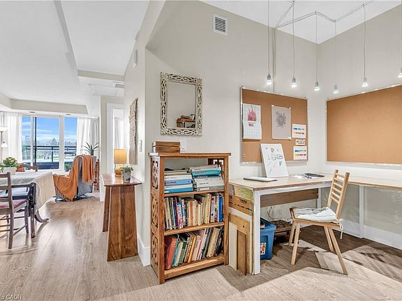Welcome to Victoria Common, a unique and luxurious midrise development just minutes from downtown! This bright and cheerful 1 bedroom plus den condo is the perfect blend of modern style, comfort, and convenience. Embrace the the bright and inviting atmosphere of this freshly painted unit, featuring vinyl floors, granite countertops, modern wood design cabinetry, and sleek glass backsplash creating a sophisticated and contemporary feel. The expansive 4th-floor balcony offers breathtaking southwesterly views of Kitchener's downtown skyline and spectacular sunsets. Imagine sipping your morning coffee or enjoying a glass of wine in the evening, surrounded by the energy of the city. Building features include: - State-of-the-art geothermal forced air heating and cooling system - Well equipped main floor gym/exercise room with floor-to-ceiling windows. - Large and luxurious party room perfect for special occasions or community hangouts. - 1 Underground parking space and ample visitor parking for guests. -1 Storage locker included and secure bike storage in the parking garage. The best of downtown Kitchener's amenities and natural beauty, just steps away: - Short walk to parks and trails. - Just a stone's throw to downtown restaurants, shops and cafe's. - Easy access to public transportation and bike trails. And, as a pet-friendly building, you can bring your furry friends along!