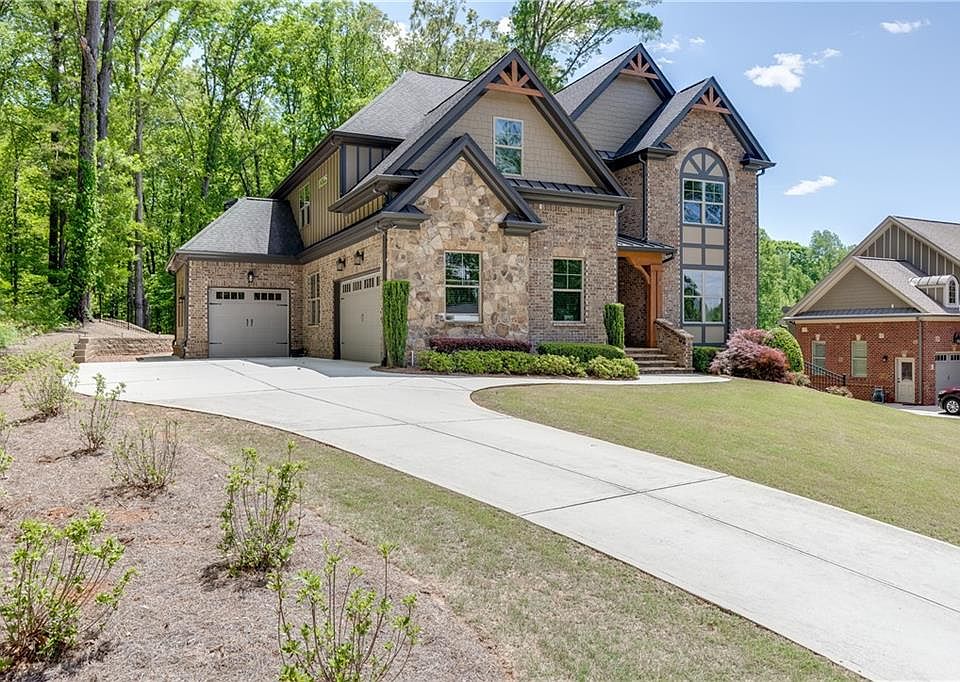 Jackson County schools - Sought after Scenic Falls subdivision. Executive Brick/stone style home with wooden accents on large level lot, double iron front door, walk out back porch, large backyard, full basement, 3 car garage, 2nd driveway and fenced back yard. Main level boasts MASTER ON MAIN, Formal living/dining room, keeping room, breakfast room, mudroom, custom kitchen with granite, undermount sink, breakfast bar, island, glass accents in cabinets, recessed oven, sep cook top, and built-in microwave. Master suite includes double sinks/vanity, tray ceiling, large closet, frameless walk-in double shower, garden tub, and private toilet room. Family room offers coffered ceilings, view to private backyard, and open to kitchen. Keeping room shows vaulted ceilings with beams, built-in cabinets, and floor to ceiling stone fireplace. Generous secondary bedrooms, with teen suite, and guest bath. Neighborhood amenities include - gated, tennis, clubhouse, playground, waterfalls, walking trails, covered pavilion, and swimming pool with cabanas.