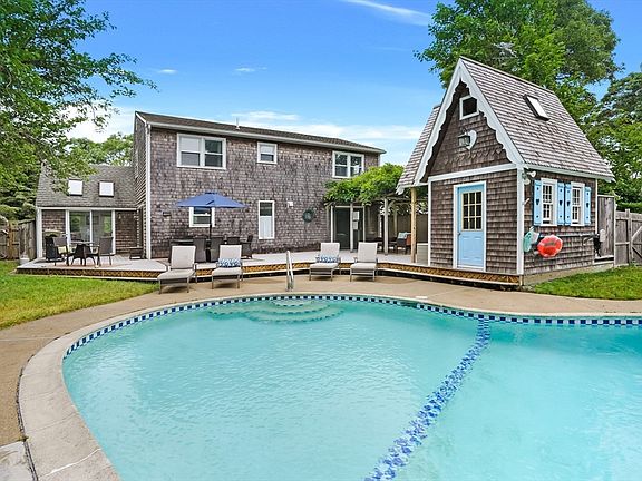 **SUMMER RENTAL ONLY** RATE IS WEEKLY** Enjoy the serenity of a four bedroom, two full bathroom peaceful oasis complete with private in-ground pool. Close to lively dining and boutiques of downtown Vineyard Haven. Unwind at neighborhood beaches; Eastville, Owen Park, Tashmoo beaches all just a few minutes drive from your vacation retreat.This lovely home spread over 1600ft of living area provides first and second floor living and comfortably hosts 6-8 guests with ease. Make memories to last a lifetime together in the large living room detailed by dramatic two-story stone fireplace. Enjoy a meal together in the formal dining for 6+ or dine-in island for grab and go. Fully stocked, furnished and ready for the perfect Vineyard vacation.The outdoor living is highlighted by IN-GROUND POOL surrounded by sprawling patio, dining for 6+ BBQ grill, outdoor shower and LOTS of FUN pool toys and yard games for all. Inquire for availability. Taxes and fees may be additional.