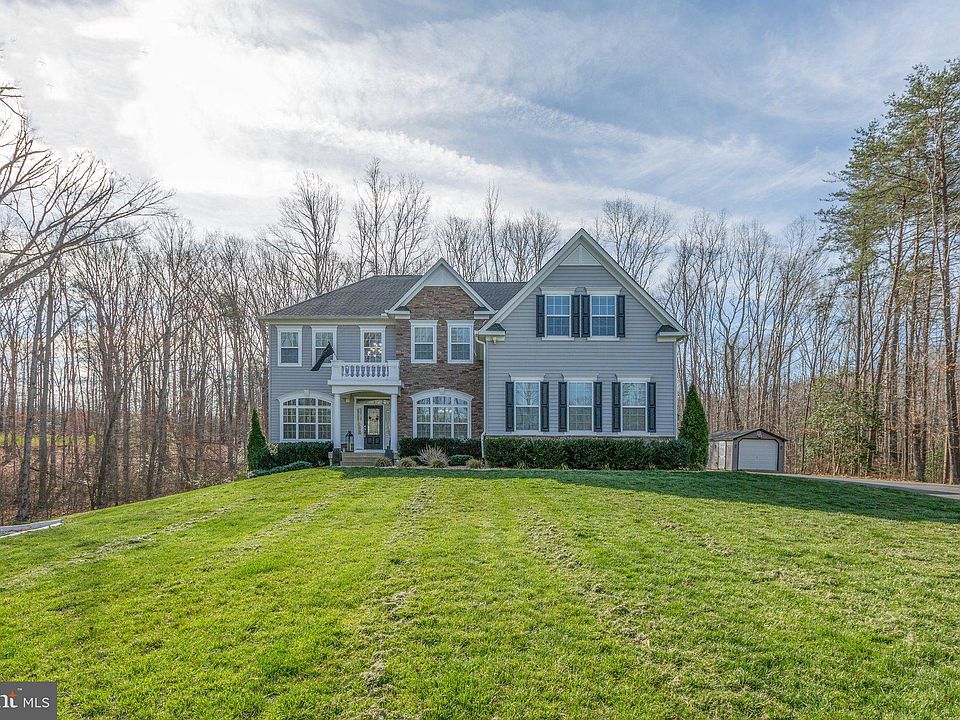 Absolutely stunning Colonial in 22406 on over 3 acres. Filled with upgrades throughout this single family residence has only had one owner. Soaring ceilings in family room feature a stacked stone propane fireplace with hearth. Formal Dining room has walkthrough bar pass to oversized kitchen and extensive trim detail. Gourmet Kitchen has upgraded solid surface quartz countertops throughout. Oversized island fits bar stools comfortably while still leaving a generous space for an eating area in kitchen. 5 burner propane range(New July 2023 - GE Brand - not same as in images) and double wall ovens complete this spacious area. Morning room has a raised bar area into kitchen and exterior doors for deck potential. Dual entry to staircase for upper level done in matching hardwoods to main level with upgraded iron spindles. Primary bedroom features dual closets surrounded by mirrored dressing area leading into a generous Primary Bath. Dual vanities, oversized soaking tub, separate shower, extensive storage, and separate water closet are featured in the Primary Bath. Primary bedroom also features large sitting area in addition to main space. Second bedroom has an en suite full bath. Third and fourth bedrooms are also located on this level. Basement is a walkout level with a media room, flex living space with a full bathroom, storage/utility area, and a rough in for a wet bar.Shed has electrical run to it. Media surround sound in basement does not convey. Fridge in kitchen does not convey. Upper level washer and dryer do not convey.