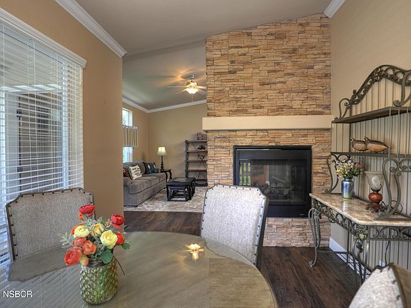 - Fireplace features: Brick/Stone, Living Room, Gas Log, Dining Room