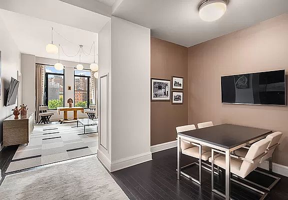 This mint condition, 1,934 square foot 2 bedroom, 2.5 bath residence boasts vaulted windows which offer charming views of the West Village complemented by the neighboring park's lush green treetops through the spring and summer, followed by a colorful panoply of fall foliage. The west-facing home gets fantastic natural light throughout the day, particularly in the afternoon and is basked in golden rays at sunset. The well-proportioned split wing layout features soaring ceilings and a floor plan with generous separation between various rooms and spaces, affording the apartment the feel and flow of a true home. Interiors by the acclaimed Thomas O'Brien feature Nanz hardware, red oak hardwood floors and exceptional custom millwork including 6-inch base molding throughout. The chef's kitchen is outfitted in custom-paneled walnut cabinetry, Sub-Zero refrigerator, Wolf oven and microwave, Miele dishwasher, and Waterworks Aero Retro fittings in a polished nickel finish. The dining area is perfectly situated off the kitchen and both are convenient to, but smartly separated from the living room, imbuing the home with a classic uptown feel. A true master suite with ample room for a king-sized bed and full furniture boasts three large walk-in closets, a sizable 5 fixture en suite master bathroom clad in white and gray marble with custom marble mosaic heated floors, an under-mounted soaking tub, a glass-enclosed shower, double sink and custom vanity, and separate water closet. The suite also has a nearly 19' long dressing area that can easily accommodate a vanity or home office setup The well-sized secondary bedroom also has an ensuite gray and white marble bathroom with heated floors.Adding to the home's allure are a full laundry room with LG washer/dryer, a four-pipe HVAC system with multi-zone climate controls, a true entry foyer, a gallery, and a neatly tucked away powder room for guests. A visionary project by renowned FXFOWLE Architects, the LEED-certified Greenwich Lane condominium remains the preeminent full-service luxury address, perfectly situated at the nexus of Greenwich Village and the West Village. The tower at 155 West 11th Street comprises just 82 units, affording residents the intimacy of a boutique building with all of the benefits of having access to what is an unrivaled suite of amenities at such a prime location; private residents' garden designed by M. Paul Friedberg & Partner, 5,000 square foot fitness center, 25-meter lap pool with hot tub, yoga & treatment rooms, Golf-simulator,residents' lounge, dining room with chef's kitchen & separate catering kitchen, 21-seat screening room, children's playroom, and bike room.