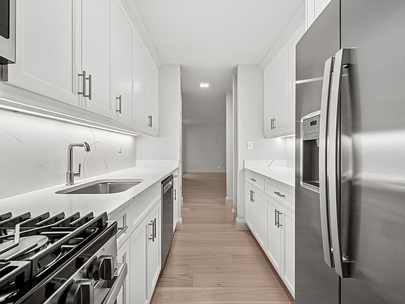 The main living area is enhanced by wide windows that bring in steady morning light and showcase open views. A contemporary kitchen features sleek cabinetry, a full suite of stainless steel appliances, and excellent storage. The bathroom is appointed with polished stone surfaces and clean, modern fixtures. Additional comforts include individual climate control, overhead lighting, and multiple closets.