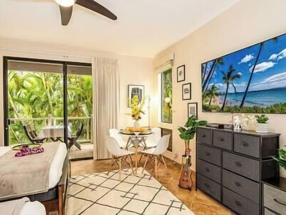 This luxurious 300 sq. ft. vacation rental at Wailea Grand Champions Villas is the perfect place for a relaxing getaway. Enjoy stunning views of the resort's pool from the comfort of your own private terrace. The condo features 2 comfortable queen-size beds, air conditioning, ceiling fans, and a 65-inch flat-screen TV for your entertainment. The bathroom is equipped with a walk-in shower and bath essentials are provided.