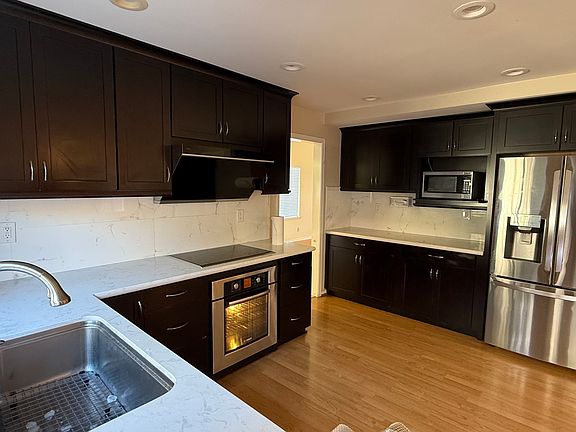 The updated kitchen features a high-end Wolf electric cooktop, sleek quartz countertops, premium stainless-steel appliances, and a dedicated walk-in pantry. This space flows seamlessly into the open dining area, perfect for family dinners.