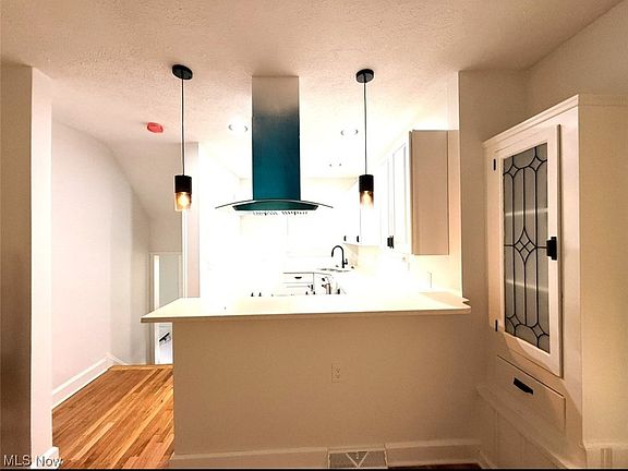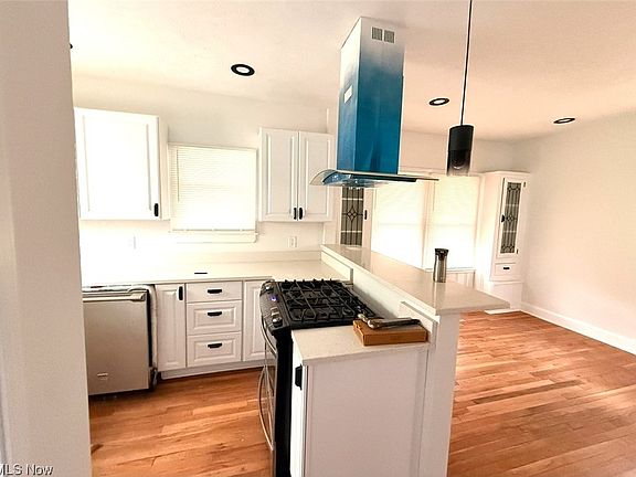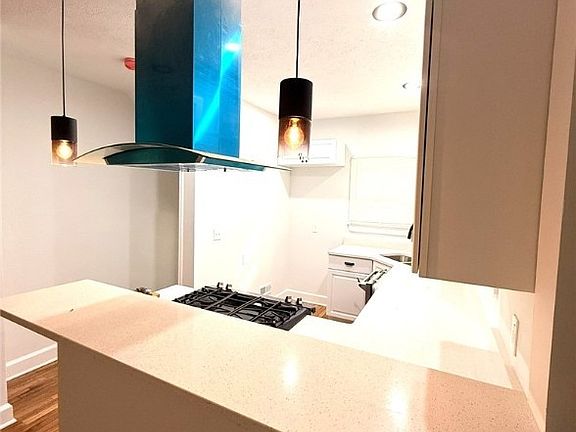 The gorgeous kitchen features quartz countertops with a convenient seating overhang, a gas stove, dishwasher, and ample cabinet space. Recessed lighting flows throughout the home, adding a warm, modern touch.