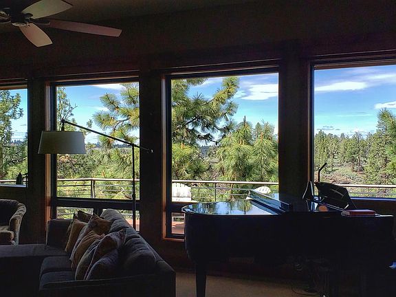Brilliantly designed custom river front home in Bend! Perched on the Deschutes River Canyon w/stunning river, canyon & mountain views. Private and peaceful! Modern NW Contemporary style offers 3 full master suites, great room w/fireplace, hickory floors, chefs dream kitchen w/72 sft island! 4 private decks. Sauna. 1330 sq ft RV suite with guest quarters. Meticulously constructed with attention to every detail.