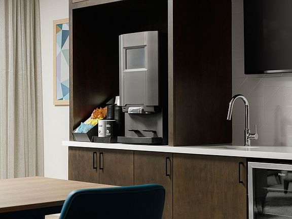 Two Bedroom One Bathroom - Two-bedroom, one-bathroom unfurnished suite featuring a modern kitchen equipped with full-size appliances, including a refrigerator, dishwasher, microwave, stove, and oven. It also features a full-size washer and dryer for added convenience. The living area offers ample comfort, while the bedroom is designed with a calming color palette, providing space for a king-size bed and a closet system with smart storage shelving.