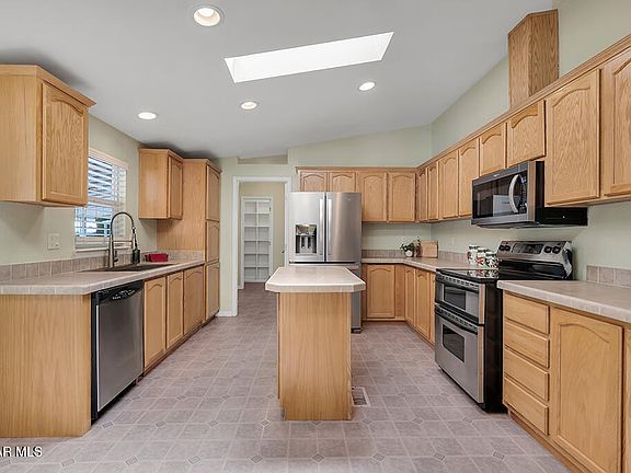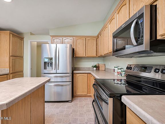 The heart of the home is an open-concept kitchen with an island, abundant cabinetry and counter space, and stainless-steel appliances — including the refrigerator. The kitchen flows nicely into a spacious dining area and large family room with vaulted ceilings, creating a warm and inviting environment for both daily living and entertaining.
