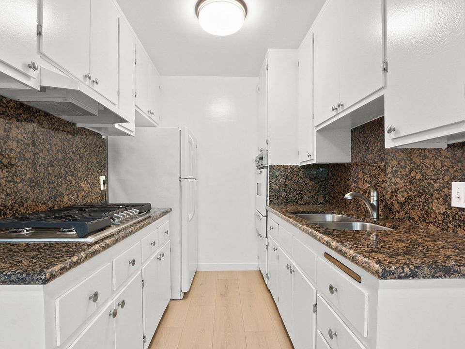 Unique opportunity to live in a lower 2 bedroom apartment in the heart of West LA, near Santa Monica Blvd. Features LVT floors throughout, granite counters, a patio, and good closet space spacious and functional layout! Must see! One parking space included. Shared laundry room onsite. Fridge included. Approx. 1000 sf.
