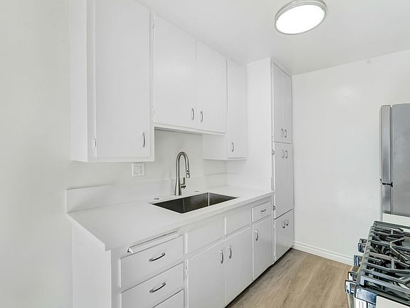 Unique opportunity to live in an upper 1 bedroom apartment in the heart of West LA, near Santa Monica Blvd. Features LVT floors throughout, stainless steel appliances, quartz counters, a balcony, and good closet space spacious and functional layout! Must see! One parking space included. Shared laundry room onsite. Fridge included. Approx. 600 sf.