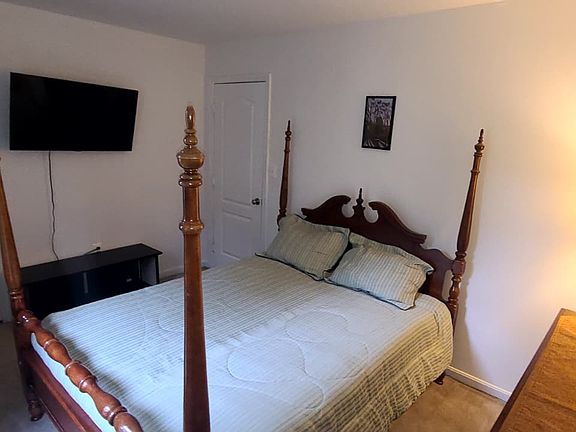 Furnished with cherrywood dresser, post bed, wall mounted flat screen smart TV.