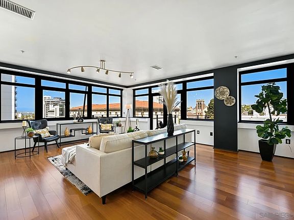 The BEST floor plan in Solara Lofts! This stunning NW corner loft residence is perched on the 6th floor of Cortez Hill, showcasing sweeping walls of glass and fantastic views of Balboa Park and the Bay. A true rarity, this light-filled home features a split-bedroom layout for ultimate privacy, wood flooring throughout, and an updated kitchen with modern appliances. Enjoy indoor-outdoor living from your private wrap-around balcony. Practicality meets convenience with ample storage, including two dedicated storage units, plus two side-by-side parking spaces. The building also offers 8 guest parking spaces for visitors. Club Solara amenities include a pool table room, foosball, gym, saunas, and a racquetball court, creating the perfect balance of leisure and wellness. Best of all, you can meet your neighbors over a glass of wine or join a cooking class at Quigley Fine Wines, conveniently located on the building’s ground floor. With abundant natural light, a thoughtful floor plan, and a vibrant community setting, this home truly captures the best of urban living in one of San Diego’s most desirable neighborhoods.