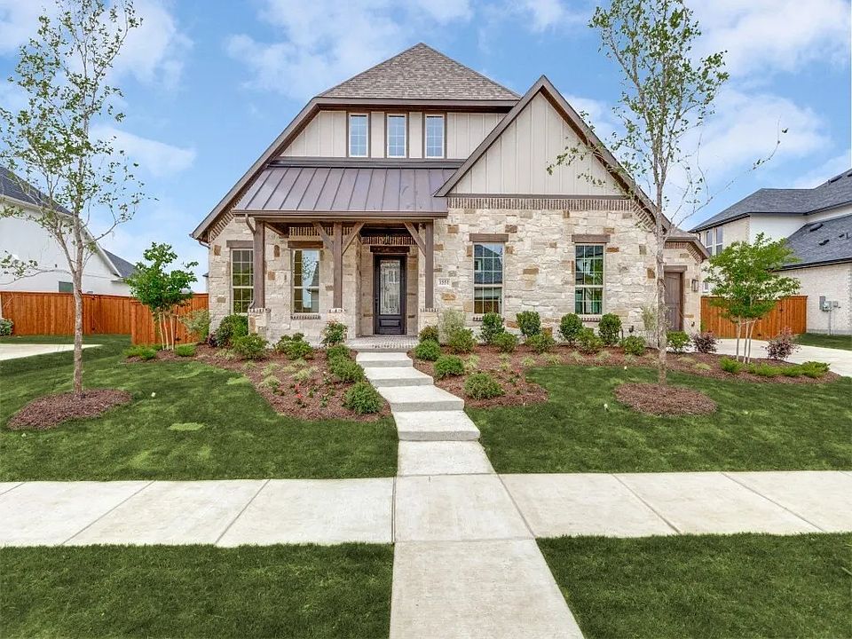 RISLAND HOMES - Ariya Plan. Honey, turn the car around - rare 4-bedroom one-story! This stunning home sits on an oversized 90'x140' lot, showcasing a striking brick, stone & cedar exterior. Inside, a wide tray-ceiling foyer leads to a chef-inspired kitchen with stainless KitchenAid appliances, pot filler, morning kitchen, oversized pantry, and a waterfall island at the center. The open dining and family room feature walls of windows and a telescoping glass door to the patio and expansive backyard. Retreat to the luxurious primary suite with spa-like bath-rainfall shower, soaking tub, and gorgeous tile details. Hardwood floors flow through all main living spaces. Three-car garage with EV charger, spacious secondary bedrooms, and a new Prosper ISD elementary (Fall 2025) complete the package. Community perks: clubhouse, infinity pool, gym, yoga lawn, playground, pond, and trails.