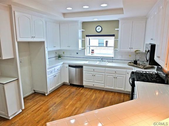 This gorgeous La Marina Estates home offers a fantastic open floor plan with abundant natural light throughout. Features include an upgraded kitchen with custom white cabinets, stainless steel dishwasher, stove, and built-in microwave and a breakfast bar. The living room flows into the dining room with skylights and bay window overlooking the lush & private backyard, family room with open beamed ceilings, fireplace, built-in shelving and slider to the brick patio and grassy yard, perfect for year round entertaining. The main bath is beautifully updated with a marble vanity and tiled shower/tub combo, and the entire home offers lovely hardwood floors, recessed lighting, crown molding, and custom paint. Wonderful neighborhood within walking distance to Cal State Long Beach, the Carpenter Performing Arts Center, and local shopping and restaurants.