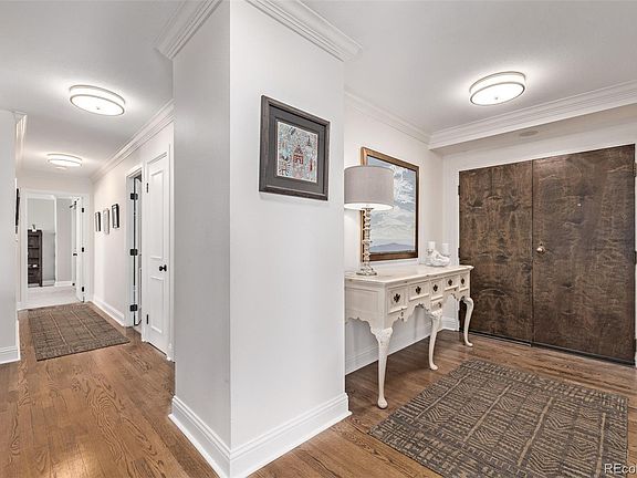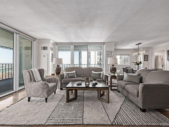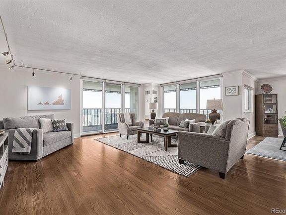 This coveted end unit at Larimer Place offers an abundance of natural light thanks to its three sides of windows and features two private wraparound balconies—one off the living room and one off the master bedroom—both providing sweeping views of the mountains and downtown cityscape. The spacious, open floor plan is beautifully appointed with hardwood floors, newer Pella windows, crown molding, natural oak wood flooring, updated kitchen with Silestone quartz countertops, a central island, and stainless steel appliances. The primary bedroom boasts a private balcony with views of the D&F Tower and 16th Street Mall, a walk-in closet, and a luxurious remodeled 4-piece bath. A guest bedroom, remodeled full guest bath, and large laundry room with built-in cabinets and full-size washer and dryer complete the living space. Additionally, the unit includes two garage parking spaces. Residents enjoy outstanding building amenities- rare guest parking recently renovated 3rd floor clubroom & hallways, tennis court, fitness center, tennis/pickle ball courts, BBQ grills, year round pool, steam, sauna, hot tub, expansive common area deck with seating areas & firepits and 24-hour front desk attendant. Lobby is currently under renovation and a grand exterior mural is planned. This prime downtown location is situated between Larimer Square and the newly update 16th St. Mall, with restaurants, shopping and businesses right out the front door.