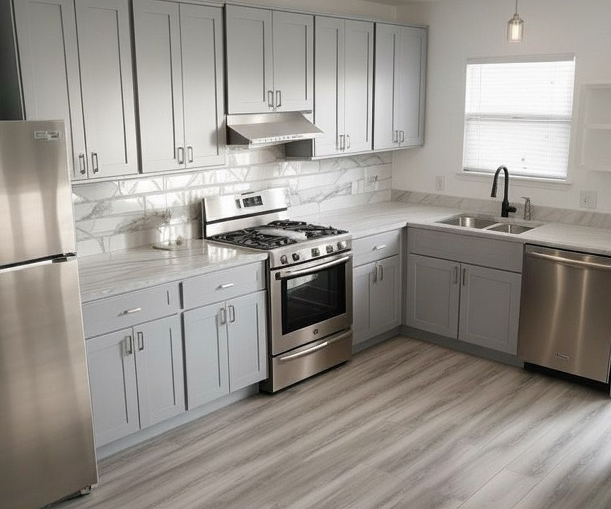 Modern flooringFresh finishQuartz countertopsNewly renovated apartmentStylish kitchen