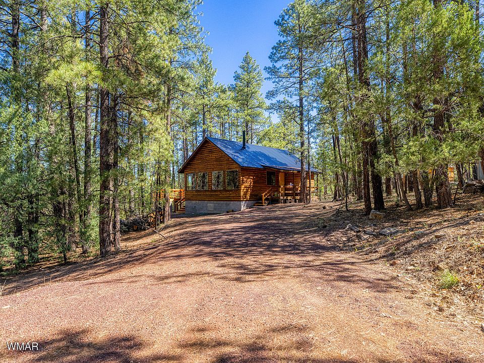 Charming Cabin in the Pines! Nestled among towering pines, this 3-bedroom, 2-bathroom cabin offers the perfect blend of rustic charm and modern comfort. Step inside to a stunning great room with soaring vaulted ceilings, exposed beams, and expansive windows that fill the space with natural light and breathtaking forest views. At the heart of the room, a unique circular wood-burning fireplace creates a cozy focal point, ideal for gathering on chilly mountain evenings. The open kitchen features a convenient breakfast bar and flows seamlessly into the main living area, making it perfect for entertaining. A separate sunroom offers a peaceful spot to relax or enjoy year-round views of nature. Upstairs, the loft serves as the third with its own powder room, ideal for guests or a private... retreat. Step outside onto the spacious deck to soak in the fresh mountain air, dine al fresco, or simply unwind under the stars. Whether you're looking for a weekend getaway or a full-time escape, this cabin is the perfect place to enjoy the tranquility of pine forest living.