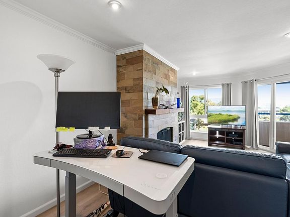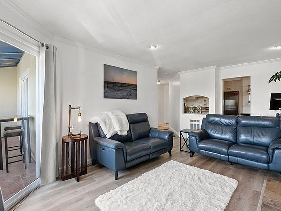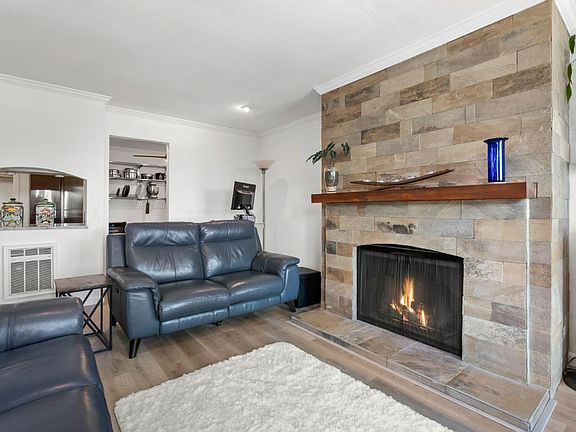 This beautifully updated top-floor condo features 1 bed, 1 bath, and 813 sq. ft. of living space. Enjoy stunning east-facing views of San Bruno Mountain. The remodeled kitchen has quartz countertops, modern cabinets with blue glass knobs, and an industrial wall for oversized appliances. The home includes luxury vinyl plank flooring, crown molding, recessed lighting, a slate fireplace, and a freshly painted interior. The bedroom offers two large closets, and the bathroom is updated with a new vanity and tub-shower combo. The unit includes a balcony, accessible from the living room and bedroom, and comes with 1 parking space in a secure garage. Community amenities include a heated pool, gym, 2 saunas, and laundry on each floor. Located near Colma BART, Serramonte, Metro Center, and major highways (280, 380, 101, HWY 1). Move-in ready, offering convenience and luxury.