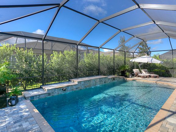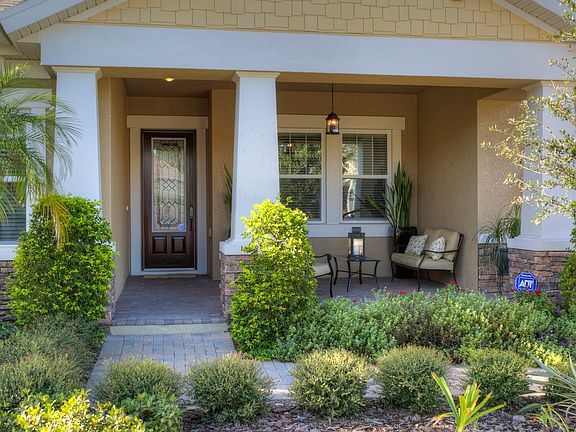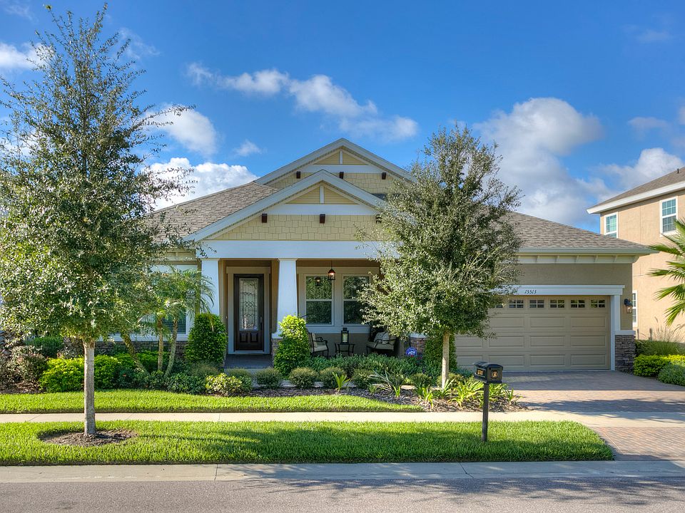 Fall in Love with this Stunning West Bay Biscayne plan. Wonderfully designed 2694 sqft / One Story Pool Home dressed with a Craftsman Style Elevation boasting 4 bedrooms, 4 full baths & a 3 Car Tandem Garage. Handsome curb appeal with lush landscaping, brick paved driveway and Front Porch greet your arrival. Upon entering, you will immediately notice all of the Gorgeous Appointments! This open plan is amazing with 12 foot ceilings & 8 foot doors throughout. A Grand Family room features a decorative field stone wall, tray ceiling complimented by crown moldings. A true gourmet kitchen with an oversized two-tier center island, breakfast bar, granite counters, 42" wood cabinets w/ crowns, built-in oven/stove, designer tile backsplash, custom hood, walk-in pantry & built in desk. The Owner's retreat is private and secluded w/ tray ceiling, walk-in closets & on suite bathroom offering granite counters, his & hers sinks, separate make-up vanity, garden tub & walk-in shower! Three way split floor plan with generously sized secondary bedrooms. The family room flows out to your private outdoor living experience with a large covered lanai, sparkling pool package and a large fenced yard. Brick paved patio is already pre-plumbed for an Outdoor Kitchen (water/gas/elec.) Surround sound throughout. Energy Efficient with tinted double pane windows. Live in the Resort Style Community w/ top rated schools and world class amenities!