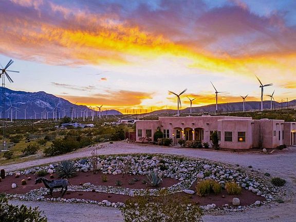 Windmill Vista, an extraordinary 8 bedroom, 5.5 bathroom custom estate set on 5 elevated acres with panoramic views of the Coachella Valley. Currently operating as an active short-term rental, this property offers a rare investment opportunity with established income potential.The open-concept floor plan features soaring ceilings, abundant natural light, and warm teak wood flooring. The chef's kitchen is fully equipped with a 5-burner cooktop, double convection oven, dual dishwashers, oversized refrigerator/freezer, wine fridge, and ample storage. Seating flows seamlessly with dining for 10 at the main table, plus island and casual options. The primary suite offers a spa-inspired restroom with double walk-in shower and private spa access. Secondary bedrooms are generously sized with ceiling fans and walk-in closets. Two laundry areas and a 150 sq. ft. storage room provide operational ease. A detached 490 sq. ft. casita with kitchenette and bath opens directly to the courtyard, offering additional rental flexibility.Entertainment abounds: the game room includes pool table, ping-pong, foosball, arcades, elliptical, and lounge with smart TV. Outdoors, guests enjoy a saltwater pool with fountains and LED lighting, heated spa, pool volleyball and basketball. Additional highlights include RV parking with hookups, multiple A/C units, security system, and an enclosed courtyard with ambient lighting that creates a private resort setting.Ideally located between Palm Springs and Joshua Tree, and just 20 minutes from Palm Springs International Airport, Windmill Vista is a proven short-term rental destination that delivers luxury, privacy, and consistent income.