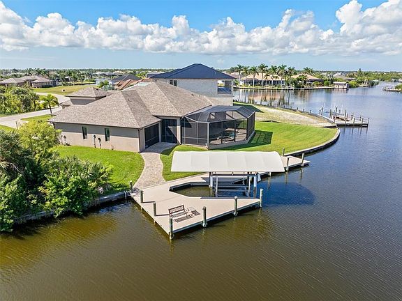 WATERFRONT LUXURY LIVING – “LUKE BROTHERS” CUSTOM MINI ESTATE HOME IN SOUTH GULF COVE! This spectacular 3-bedroom, 3.5-bath, 3-car garage waterfront pool home offers the ultimate blend of luxury, comfort, and Florida coastal charm. Sitting proudly on almost a half-acre sailboat water tip lot with 149 feet of concrete seawall and mesmerizing views of intersecting canals! This property has one of the closest locations to the lock with immediate access to the river! From your covered composite dock with water and electric, a 10,000 LB boat lift, and a lower deck perfect for kayak access, you’ll have quick access to Charlotte Harbor and the Gulf of Mexico. Step inside and feel the elegance immediately. With over 3,200 sq ft of meticulously designed space, this home features two master suites, each with its own private ensuite bath and lanai access. Volume ceilings soar high above with lighted double tray details in the great room, dining room, and both master suites—adding brilliance to every gathering. The porcelain plank tile flooring, plantation shutters, and crown molding create a polished and timeless appeal throughout. The grand center island kitchen is a chef’s dream, complete with rich wood cabinetry, under-cabinet lighting, and Cambria quartz countertops that flow seamlessly through the entire home. Enjoy a built-in pantry with pull-out drawers, slow-close cabinets, and a lighted quartz bar that makes entertaining effortless. Every glance from the kitchen, dining area, and great room leads your eyes to the sparkling pool and wide canal views. Each bedroom is generously sized with walk-in closets, lighted tray ceilings, and spa-inspired bathrooms featuring quartz counters, dual sinks, and tiled walk-in showers with glass enclosures. The oversized three-car garage offers epoxy flooring, a built-in workshop, and a central vacuum system. The brick paver driveway and double leaded-glass entry doors set an impressive tone, while the paver pool deck, under-fascia lighting, and lighted dock path make evenings magical. With sprayed attic insulation, your home stays cool and efficient year-round. Located in the highly desirable South Gulf Cove waterfront community, this property offers convenient access to shopping, dining, Town Center Mall, Boca Grande beaches, and the beautiful Gulf waters. Whether boating, fishing, or relaxing by the pool and spa, every day feels like paradise in this high-quality, custom-built home. Schedule your private showing today and experience waterfront luxury at its finest!