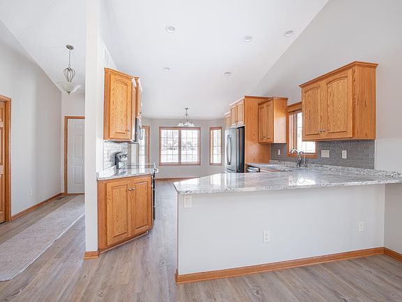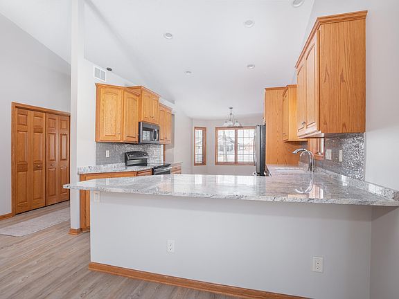 This Twin Home has a luxurious feel and is located on the Little Crow golf course. Freshly updated 3 br, 3 ba home has an open floor plan with vaulted ceilings and over 2,500 finished sq ft. Large living room has a stone fireplace from floor to ceiling and the kitchen features granite countertops, stainless steel appliances, new backsplash, and is combined with the dining/living room. Primary bedroom (ML) has a large walk-in closet and private bath. Main level also features a laundry room and walkout access to the backyard deck. Lower level includes two additional bedrooms, full bathroom, 14 x 20 storage room, and a huge 15x30 family room. Attached 2-stall insulated garage is a bonus! Association includes lawn care, garbage, snow removal, and the pleasure of easy living! Its central location provides easy access to the state DNR trail, winery, surrounding lakes, downtown shops, schools, churches, and much more!