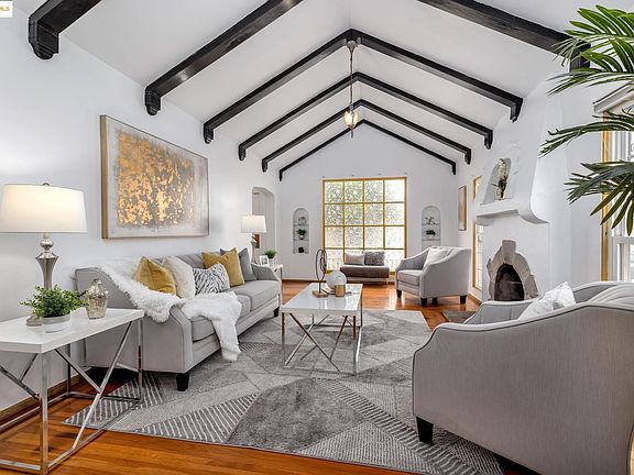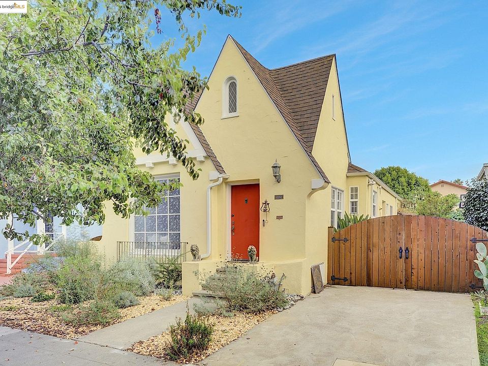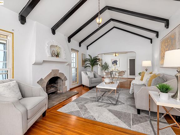 Step into storybook charm in this 1929 Tudor bursting with character and modern upgrades. Behind its cheerful stucco exterior and arched entry lies a warm, light-filled home with refinished hardwood floors, a cozy living room with vaulted beamed ceiling, and a sunny dining area that flows into an updated eat-in kitchen. The kitchen features stainless appliances, and a charming breakfast nook perfect for morning coffee. Two comfortable bedrooms and a refreshed bath create a thoughtful layout all on one level. Energy-saving owned solar panels and forced-air heat add comfort and efficiency. Outside, enjoy a fenced backyard ideal for entertaining, gardening, or relaxing under the California sun. The detached garage and off-street parking provide convenience and extra storage. Located just minutes from BART, shopping, and freeway access, this enchanting Tudor blends vintage character with modern livability in the heart of Oakland.