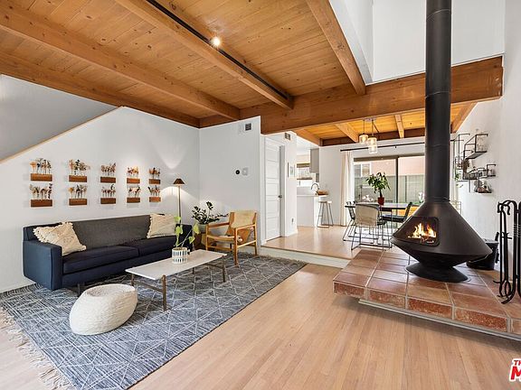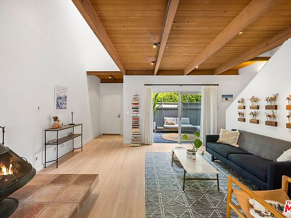 Don't miss this rare opportunity to own a stylish two-level townhouse-style condo in one of Santa Monica's most sought-after neighborhoods. The bright and inviting entryway features soaring open-beam ceilings and a skylight that floods the space with natural light. Enjoy a recently remodeled kitchen equipped with stainless steel appliances, quartz countertops, a pantry with roll-out shelves, and durable porcelain tile flooring. The spacious living room is anchored by a sleek mid-century modern fireplace, adding warmth and character to the home. Step outside to two private enclosed patios the larger one is outfitted with overhead lighting and ample seating, perfect for al fresco dining or entertaining guests. Additional highlights include custom oak flooring, recessed and studio track lighting, ceiling fans, an in-unit washer/dryer, NEST thermostat, and low HOA dues that include earthquake insurance. The secure building offers one assigned garage parking space and a bonus storage container. Tucked away on a quiet street, yet just minutes from the Expo Line, downtown Santa Monica, cafes, and restaurants.