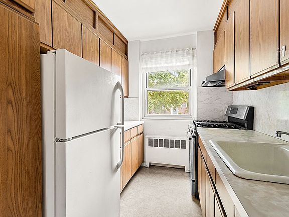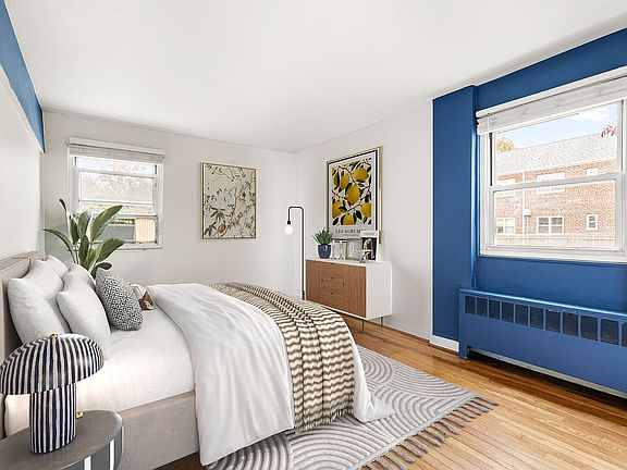 The living room faces the landscaped courtyard, creating a comfortable space for both relaxing and entertaining. Hardwood floors run throughout the apartment, adding a cohesive and polished feel. The oversized bedroom easily fits a king-size bed, multiple dressers, and a seating or work-from-home area. A deep closet in the bedroom and three additional closets — including a linen closet off the living area — provide exceptional storage. The kitchen offers counter space on both sides and can accommodate either a dishwasher or a washing machine, as permitted by the co-op.