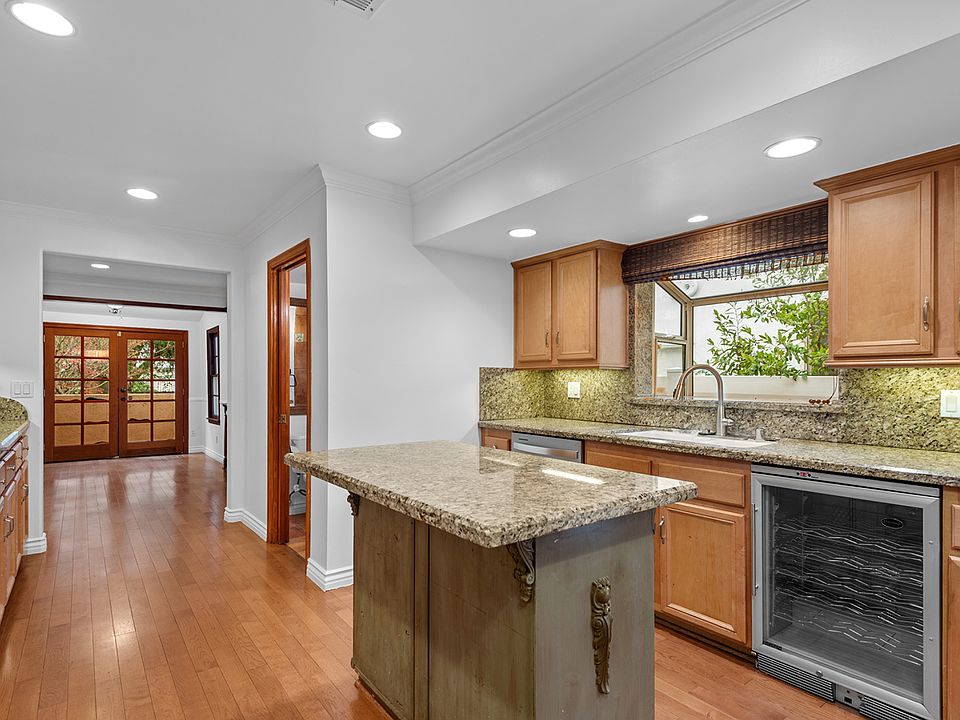 Old-world charm meets modern convenience in this beautifully updated and gated Sherman Oaks home. Set on a landscaped 8,000 sq. ft. lot, the property features two spacious bedroom suites with private baths, hardwood floors, and French doors opening to patios and a lush backyard. The gourmet kitchen offers granite counters, a center island, stainless steel appliances, a five-burner gas range, and a wine fridge. The main suite includes a fireplace and direct access to the yard with a patio and fountain, creating a serene outdoor retreat. A beautifully appointed, detached finished space is ideal for use as a home office or creative studio. Additional highlights include copper plumbing, a gated driveway with ample parking, and close proximity to Ventura Blvd. shops, dining, and Hesby Oaks Leadership Charter K-8 School.
