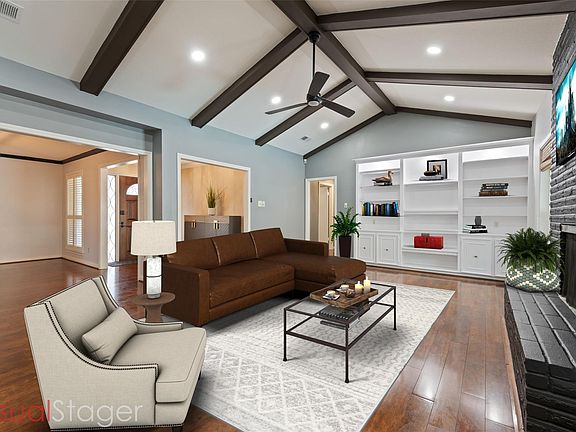 Sparkling poolCozy gas log fireplaceBackyard retreatCustom built-insSoaring ceilingsLarge game roomMature trees