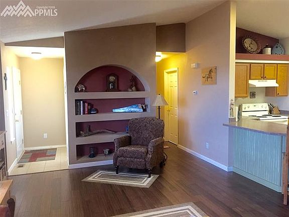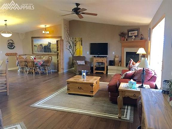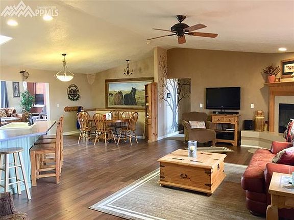 As you pull up to this home and its entrance that welcomes you at first glance you will notice the details in the location of the home, barn, outbuilding/+2nd garage, loafing shed/and or extra outside storage. Property is totally safe fenced for your horses already. Front of home features spacious covered vaulted front porch area as you enjoy the gorgeous view of Pikes Peak. Closed in front yard area. As you enter the home you notice right away the open floor concept welcoming you home. Please read supplemental Remarks Living/kitchen/dining room features vaulted ceiling very open. Hardwood floors. Corner gas fireplace. kitchen eating bar. Laundry room off kitchen. All window treatments stay with home. Oversize doorway leading into the family room/great room 9+ ceiling, corner pellet stove, lots of windows, slider over looks back yard area, barn, horse pasture, stall area. (your able to turn on outside barn light if needed by remote control inside the home). Master suite is located in its own private corner of the home. View of Pikes Peak. 5-piece master with walk in closet. Stairway leading down to the 1250 sq.ft unfinished basement area featuring rough-in bathroom, bright window wells, plus another 350 sq.ft. crawl space area. Basement door leads to oversize garage which features a outside man door entrance. great for those cold winter days. Don't have to mess with opening the garage door. Outside buildings barn with upper loft area, hay storage area, 2 walkout stall areas with mats, outside over hang. fenced and cross fenced. electric fencing is in placed just need to buy a solar panel. Homes owners have taken excellent care of the pastures/grounds. Barn has water and electricity The extra outside materials you will see are staying with the property. Welcome home..