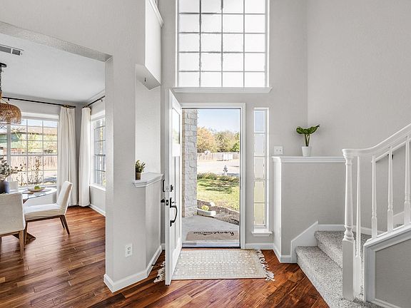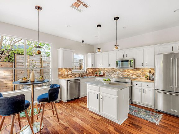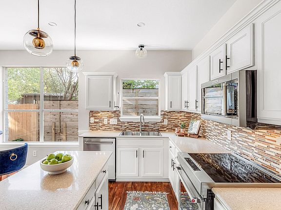 Situated on a landscaped corner lot in Willow Run, this 3-bedroom, 2.5-bath home has been extensively renovated. Interior updates include fresh paint, trim, modern light fixtures, ceiling fans, hardware, and honeycomb blinds. The kitchen features granite counters, updated appliances including refrigerator, dishwasher, induction and convection air-fry range, and microwave. A gas line remains in place at the stove location, and a 50-amp 220-volt breaker currently serves the induction range but can be converted to support an EV charger in the garage. All bathrooms were fully remodeled. The powder bath includes an updated vanity and large-format tile flooring. The secondary bath includes a modern soaking tub and shower combination with 12x24 tile and a sleek framed mirror. The primary suite includes an oak dual-sink vanity, frameless glass shower with full tile surround, a freestanding soaking tub, and a tempered low-E window. HVAC was replaced in 2024 with smart thermostats. Exterior improvements include fully replaced backyard treated cedar fence with steel supports, modern front and back doors, updated exterior lighting, side walkway, mulch and plantings, and professional tree trimming. The garage includes an upgraded opener, above-garage storage system, and refrigerator. The HOA provides access to Wells Branch community pools, recreation center, dog park, Katherine Fleischer Park, and walking trails. Convenient access to I-35 at approximately 1.2 miles, H-E-B grocery at 1.4 miles, and The Domain District about 5 miles away.