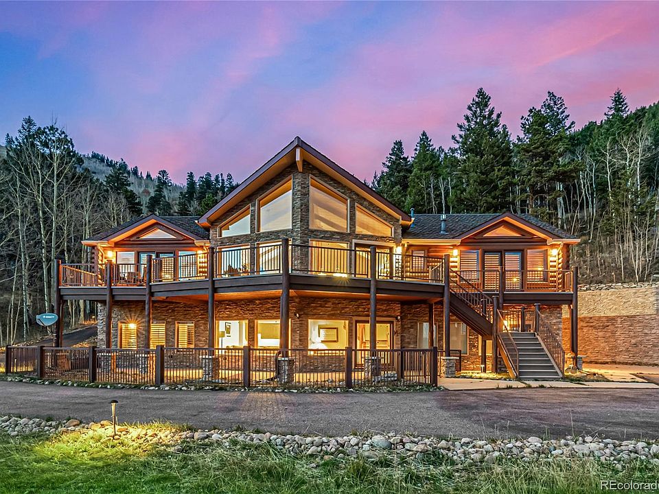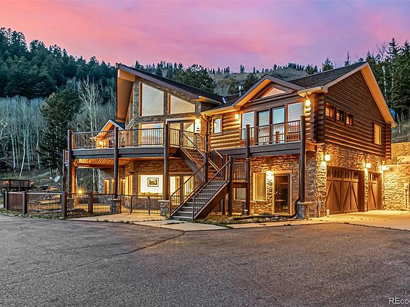 A gated private drive leads to a heated three-car garage with a dedicated workshop and 220V power, ideal for projects or extra storage. The exterior blends log, stone, and timber with large picture windows that frame panoramic views of Mt. Evans and the surrounding foothills. Inside, rich red oak floors, vaulted ceilings, and a dramatic stone fireplace set the tone for a warm yet elegant mountain retreat.