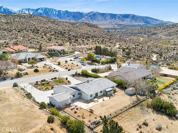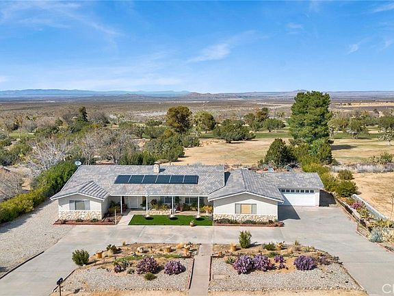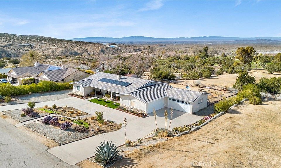 Sprawling Single-Story Estate with Golf Course Views. This stunning single-story home in the prestigious Crystalaire Country Club offers exceptional curb appeal, a spacious layout, panoramic views of the golf course, and intoxicating mountainous views. Enjoy the privacy and space between neighbors on this expansive lot. The home features 3 bedrooms, 2 bathrooms, a sunroom, and an enclosed patio with abundant natural light and breathtaking mountain views. This floor plan includes a large living room, family room with a custom stone fireplace, and a dining room. The upgraded kitchen with white cabinetry, and gorgeous quartz countertops. Additional highlights include a 4-car garage with two separate garages, paid-off solar panels, and low-maintenance desert landscaping. RV access and plenty of parking make this home perfect for those with multiple vehicles.