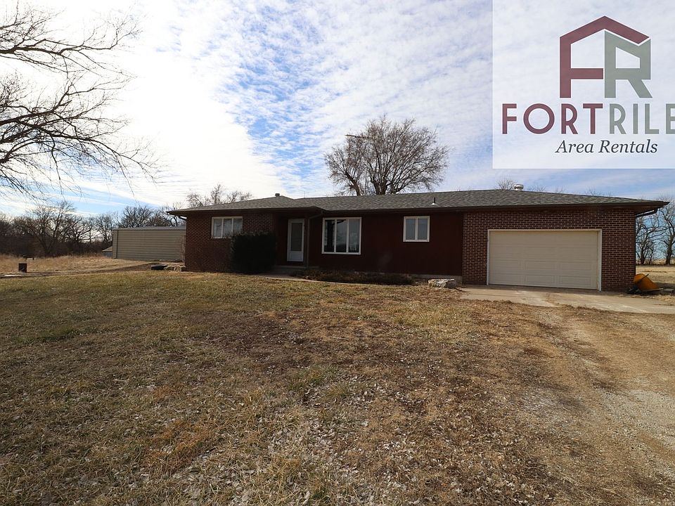 This unique country home will astound you with how peaceful and beautiful the area is. This home sits on 5 acres and is located just 15 minutes from town on the edge of Chapman with an Abilene address. The home has a wide-open living area that greets you as you walk in the front door. Each of the 4 bedrooms is equipped with large closets and 3 of them with ceiling fans. You'll find 3 separate living rooms 2 of which have fireplaces which will be ideal in the winter. All bedrooms are located on the same level with one of the living areas in the basement. This home has a 2 car attached garage and a 1 car detached shop in the back. The smaller part of the detached shop is available for use. The larger side, however, will not be available for tenant use. If you enjoy peaceful scenery with breathtaking views and a spacious house don't hesitate to make this home yours.