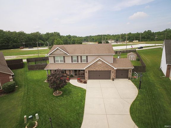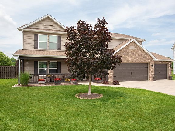 Welcome to this beautifully maintained one-owner, all-electric home featuring 4 bedrooms, 2.5 baths, and nearly 2,600 square feet of living space on a spacious .4-acre cul-de-sac lot in the desirable Mason’s Ridge neighborhood. Perfectly positioned on Lafayette’s south side, this home offers quick access to 350 S, US 52, US 231, Purdue University, shopping, and TSC schools. The thoughtfully designed two-story floor plan features two inviting living areas on the main level along with a versatile formal dining room that can also serve as an office or den. The well-appointed kitchen includes black stainless appliances, a large stone island, tiled backsplash, and pantry, and opens to a casual dining area leading to a generous deck with built-in seating—perfect for entertaining or relaxing. The expansive, fully fenced backyard offers a circular paver firepit area, playground (or future garden), patio pavers, and a 12x10 storage shed. Inside, the first floor also features a mudroom with built-in cubbies, a half bath, and an oversized 3-car garage with attic access and pull-down stairs for additional storage. Upstairs, the spacious owner’s suite offers a dual-sink vanity, newly updated tile tub/shower and flooring (2024), and a large walk-in closet, accompanied by three additional bedrooms, a second full bath, and a conveniently located laundry room. Recent upgrades enhance both comfort and efficiency, including a front-yard sprinkler system, comprehensive alarm system with cameras and sensors, motorized blinds, new HVAC system (2020), all-new kitchen appliances (2024), new Speed Queen washer and LG dryer, new water softener (2025), new flooring throughout the family, front, and dining rooms, freshly painted deck (2025), and updated exterior wood and garage door paint (2025). Combining energy efficiency, modern upgrades, and a prime location, this exceptional home delivers the perfect balance of style, functionality, and convenience.