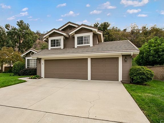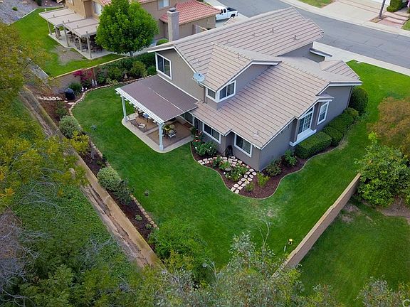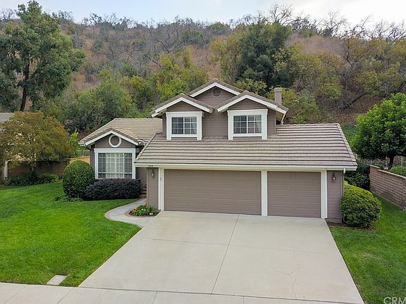 IMMACULATE, REMODELED CUL-DE-SAC HOME SITUATED AGAINST A QUIET HILLSIDE IN VIA VERDE. Beautiful curb appeal offers a green lawn, professionally painted exterior & brick steps leading to the front porch. Front door opens to an entryway w/hardwood floors, a chandelier & an open floor plan. Living room & formal dining room are separated by a wood banister & offer carpeted floors, vaulted ceilings & plantation shutters. Remodeled kitchen w/tiled floors, oak cabinetry, silestone countertops, black appliances, glass tiled backsplash, convection oven & microwave, warming drawer, recessed lighting, a spacious pantry, built-in buffet & an eating area that overlooks the family room. Family room w/carpeted flooring, a brick fireplace w/wood mantel, recessed lighting & a slider w/full plantation shutters. Downstairs also has a bedroom w/built-in desk, separate bathroom w/shower & an indoor laundry room. Upstairs master bedroom w/double door entry, vaulted ceiling, blinds & drapery. Master bathroom w/new cabinetry, dual sinks w/travertine countertops, porcelain tile flooring, travertine shower w/frameless glass surround, separate soaking tub, a walk-in closet & a private water closet. Two additional bedrooms upstairs w/a separate full bathroom & a wall of linen cabinets. Backyard offers a covered patio, green lawn, a rose garden w/stepping path, back planter & a hillside backdrop covered with ivy & trees. Other upgrades include dual-paned slider, finished garage w/cabinets & workbench.