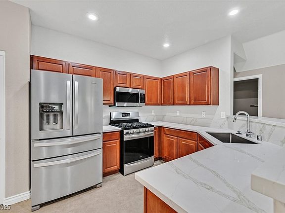 Step into style with this stunningly upgraded 3-bedroom, 2.5-bath townhome in the gated Old Vegas Ranch community! Bright and open living area features sleek ceramic tile and a cozy fireplace perfect for relaxing evenings. The gourmet kitchen shines with new quartz countertops, stainless steel appliances, roll-out drawers, large pantry, and a spacious dining area. Upstairs, luxury vinyl plank flooring flows throughout, and the primary suite impresses with a spa-like bath boasting quartz counters, custom-tiled shower, and modern finishes. Enjoy your own private backyard retreat with a covered patio and lush professional landscaping. Community perks include a sparkling pool, spa, walking trails, and skate park. Prime location near top dining, shopping, parks, and freeways. Immaculate, stylish, and move-in ready this home has it all!