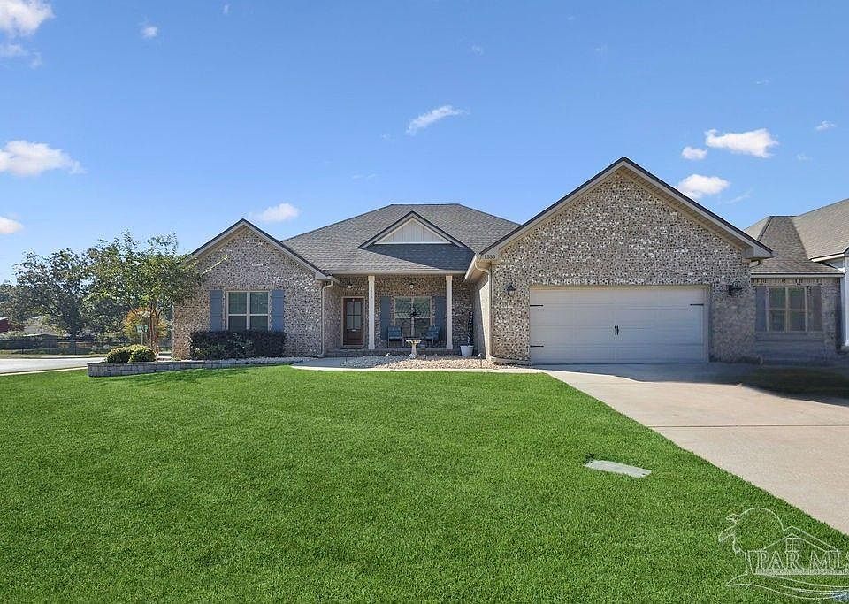 Welcome to Harmony Estates, one of Cantonment’s most desirable neighborhoods known for its quality craftsmanship, safety, and pride of ownership. This beautiful all-brick home has been maintained by one family and offers 4 bedrooms, 3 bathrooms, a bonus room, and 2,824 square feet of living space (4,018 sqft under roof) on a spacious 0.28-acre corner lot. From the moment you arrive, the curb appeal stands out—custom front and backyard landscaping, accent lighting, and a wide driveway leading to an oversized 2-car garage. Inside, you’ll find tall ceilings, crown molding, and an open layout that flows effortlessly from the foyer into the formal dining area and large living room. The kitchen is a dream, featuring quartz countertops, a 5-burner gas range, Samsung appliances, a farmhouse sink, and both a breakfast nook and bar seating area—perfect for entertaining or family gatherings. The primary suite is a peaceful retreat with tray ceilings, natural light from large windows, and a luxurious bathroom complete with a custom tile shower featuring rain, standard, and handheld shower heads, a double vanity, a private bathroom, generous linen storage, and a walk-in closet that feels like its own room! Additional highlights include a tankless gas hot water heater, LVP flooring throughout with tile in the bathrooms and carpet in the bedrooms, and cased windows and doors throughout for a refined finish. Step outside to enjoy the screened-in back porch that opens onto a custom paver patio, perfect for morning coffee or grilling in the evenings. The fully fenced backyard includes a storage shed, full irrigation system, double and single gates, and whole-house gutters. The garage entry area is as functional as it is beautiful, featuring a built-in hall tree and mudroom, a custom desk nook, and an oversized laundry room with ample storage. This home truly has it all—space, quality, and peace of mind knowing no more homes will be built in this well-established subdivision.