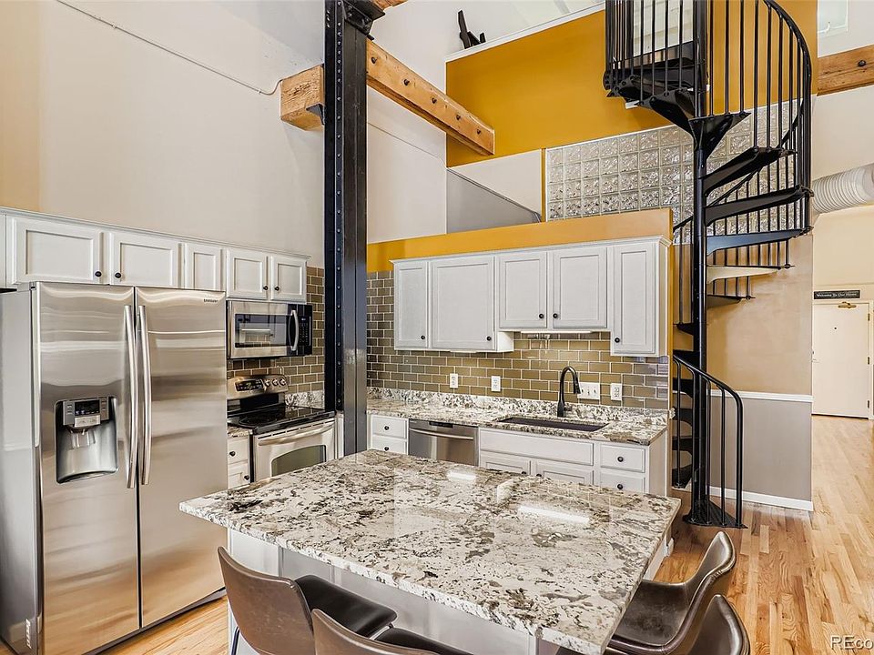 Location, Location, Location! Don't wait to come see this spacious and charming 2-level home in the heart of downtown Denver! This home has been loved and cared for by the same owner for ten years! This home doesn't live like a small and tight downtown condo - it offers tons of space to stretch out with it's light & bright open concept floorplan with 2-story vaulted ceilings and large windows! The main level boasts a stunning original brick wall, timeless hardwood floors throughout and offers a large kitchen with a huge island, granite countertops, stainless steel appliances, and tons of storage! The kitchen is open to the great room, which is perfect for entertaining friends and family! The main level also includes a large bedroom with walk-in closet, a spacious full bathroom with large soaking tub, and laundry! Up the charming winding staircase you will find another large bedroom with walk-in closet, and private e-suite! The home comes with a deeded (covered & secure) parking space, as well as access to wonderful amenities, including the gym and guest suite for visiting friends and family (both also located on the 4th floor), and more! This home was recently updated with quartz countertops in the kitchen and bathrooms, freshly painted cabinets, stainless steel appliances, and fully exposed brick wall to accentuate the homes historic lifestyle! Located just steps to everything you need - restaurants, taverns, Larimer Square, LoDo, Coors Field, Target, and everything that downtown Denver has to offer! It's also located at the 16th & California light rail station, so leaving downtown is a breeze! Come see what all this home has to offer!