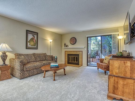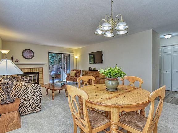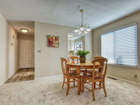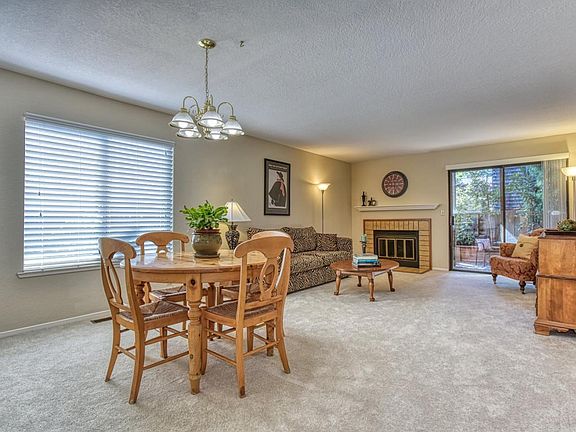 Spacious downstairs unit with private charming patio and mature landscaping. Light and bright kitchen with garden window- refrigerator is included. 2 bedrooms, 1.5 bathrooms with two separate sink areas for privacy. Open dining and living room with wood burning fireplace. Sliders to patio. New carpet and LVT flooring throughout. Washer and dryer in unit and included! Nest thermostat. 1 car detached garage with auto opener plus 1 additional dedicated parking spot close to the front door of the unit! Community pool and spa.