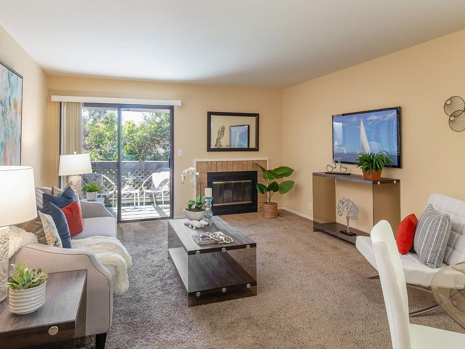 Oak Tree Corner is a beautiful community with an abundance of mature trees and foliage! This upper-level end unit is positioned near the community pool and within walking distance to restaurants and shopping. Located within the highly sought after Las Animas Elementary, Solorsano Middle and Christopher High School attendance area too! The living room and primary bedroom offer sliding door access to the balcony while the spacious dining area includes a large pass through to the kitchen adding to this open floor plan. The primary bedroom offers 2 closets and a private vanity. The second bedroom has private access to the hall bathroom. Enjoy the fireplace and many windows to brighten the rooms. The kitchen refrigerator, new beverage refrigerator, washer and dryer stay with the property. A detached one car garage and assigned parking are included as well.