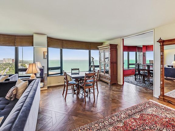 Experience 1555 N Astor, Unit 36E-where breathtaking lake and skyline views take center stage. This stunning half-floor residence offers 3 spacious bedrooms, 3.5 baths, and luxurious living spaces throughout. Perched on the coveted east tier, the home features wraparound views of Lake Michigan, Lincoln Park, the zoo, North Avenue Beach, and sweeping southeast vistas of Downtown and Navy Pier. The home's layout is thoughtfully designed with an emphasis on space and style. The living room and formal dining area are perfect for hosting gatherings, highlighted by 40 feet of breathtaking northeast views. Throughout the home, you'll find custom details like elegant Arenberg-style inlaid hardwood floors and fantastic closet space. The oversized eat-in kitchen boasts custom Burl wood cabinetry, granite countertops and flooring, plus high-end Sub-Zero and GE appliances. The grand primary suite is a serene retreat with three walk-in closets and a cozy sitting area/office that showcases some of the unit's best views. The marble-wrapped primary spa bath offers a soaking tub, a separate shower, dual sinks, and a dressing area for added luxury. Unique to this residence, the expanded laundry room includes a sink and full-sized machines. Additional highlights include Venetian plaster finishes in the entry and primary suite, custom hardware, and built-ins throughout. Residents of 1555 N Astor enjoy an array of top-tier amenities: 24-hour door staff, a live-in engineer, on-site management, an indoor pool with an outdoor sundeck, an exercise room, sauna, tennis and pickleball court, and a basketball hoop. Parking is hassle-free with unlimited valet parking for $200/month, free daytime guest parking, and a $10 car wash service. Located in the heart of the historic Gold Coast, this pet-friendly building offers the best of luxury living in one of Chicago's most desirable neighborhoods.