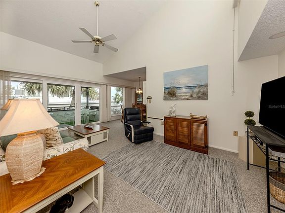 Bahia Vista Gulf, a condo community nicely situated on the Gulf of Mexico on Venice Island. This Amazing 2 BR, 2 BA Turnkey Furnished Condo offers a perfect blend of comfort and coastal living on the Gulf of Mexico. Located on the second floor, the unit features soaring vaulted ceilings that create an open, airy feel complemented by abundant natural light throughout. The comfortable living room opens to the dining room as well as a convenient slider to one of two private balconies. The second balcony offers a breathtaking partial view of the Gulf in turn providing the perfect spot to unwind while enjoying amazing sunsets directly from the master bedroom and is accessed from both the master and guest bedroom. New AC. Hurricane-rated windows and sliders added in 2018 ensure peace of mind while enhancing this condo's safety and energy efficiency. Also, an inside laundry closet with a new washer and dryer. The bright and well-appointed interior is again fully furnished allowing you to move in and immediately enjoy the beauty and tranquility of Gulf/Beach living at its finest. Whether you're relaxing indoors or outside on the balconies, this condo provides ideal setting to enjoy the sights and sounds of the Gulf coast. Bahia Vista Gulf offers a coming soon renovated private beachfront saltwater heated pool with coming soon renovated sundecks to enjoy socializing and relaxing by the pool. Adding to the desirability for BVG is the fact that there is a minimum 1 month rental and can be rented 12 times a year and it is not a 55+ complex. The condo is only a short walk from your assigned parking spot, guest parking, mailroom, and private storage locker and onsite laundry facility. Offering a great location in a beautiful and friendly community on the beach, close the The Jetty, Crow's Nest, Venice public beach and the Historical Downtown Venice, this is great location, and you won't be disappointed!! Schedule your private showing today and start living your Dream in Paradise!