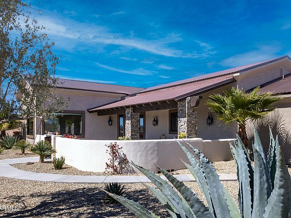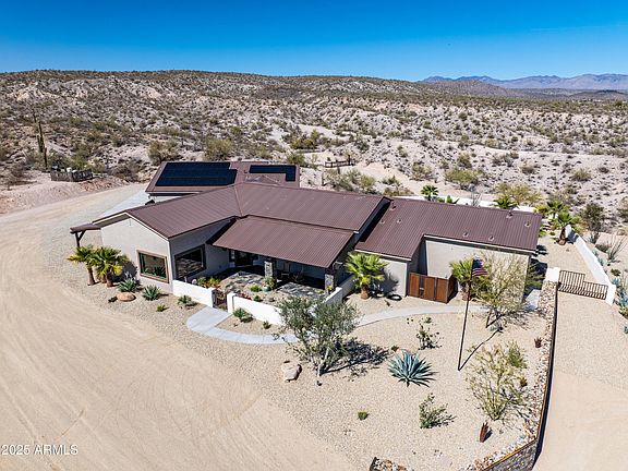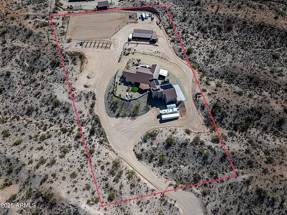 Panoramic Views bordering State Land! Home & Horse property on 5 acres (additional adjacent land available, two - 5 acres lots). Open floor plan, tall ceilings, Kropf Craft knotty alder cabinetry throughout, engineered wood floors, split floor plan, oversized kitchen and pantry. Hobby garage/workshop below the suspended garage floors (not seen in pictures) has office and cooled storage room. Solar panels & Tesla charging wall feed into APS but can be manually turned off to be off grid. Private well & private gated entrance. 8 covered stalls, roping arena (room to expand) 20' container/tack with power. RV parking by home and horse stalls with water, 30 & 50 amp power hook ups. Plenty of room to add a private pool, spa, pole barn, barndominium or casita/guest house. 3 Bedrooms with walk in closets, office/den, 2.5 bathrooms, dining area, great room and living area, oversized 3 car garage plus workshop/storage rooms, large covered patios front and back & covered outdoor bbq area.