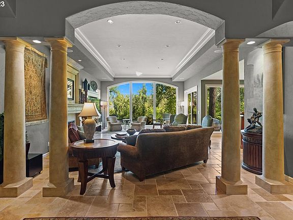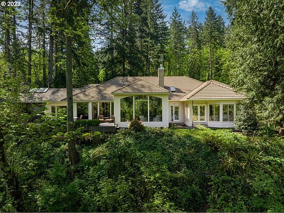 A slice of Paradise. Palm Springs style home meets "historic rich" Clackamas River Drive on a very quiet and gated private 8.14 acres. Creek and natural 25 ft waterfall run through the property with two additional water features. Trail access to the River. True Gourmet kitchen w/Travertine tile, vaulted ceilings, covered patio with fireplace and BBQ area, oversized 3 car garage, 2000 bottle wine cellar and detached "self contained" guest house with garage. 24x32 ft shop with separate gated entrance.